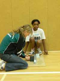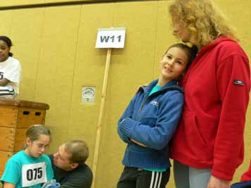 Annika Reinartz betreut J. Adamou vor dem 30-Meter-Start ... Tränen und Freude liegen oft zusammen; gut, dass Mama und Papa da sind.
